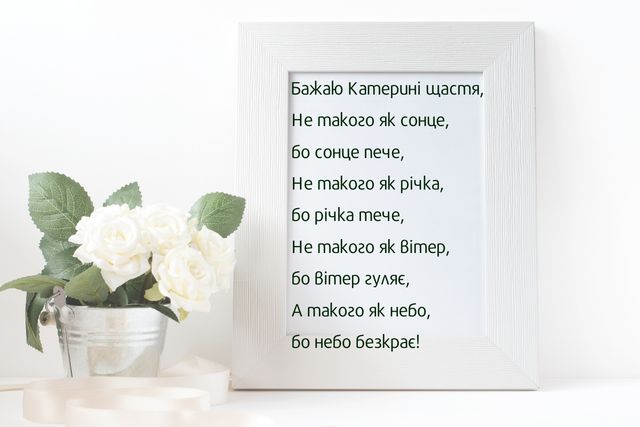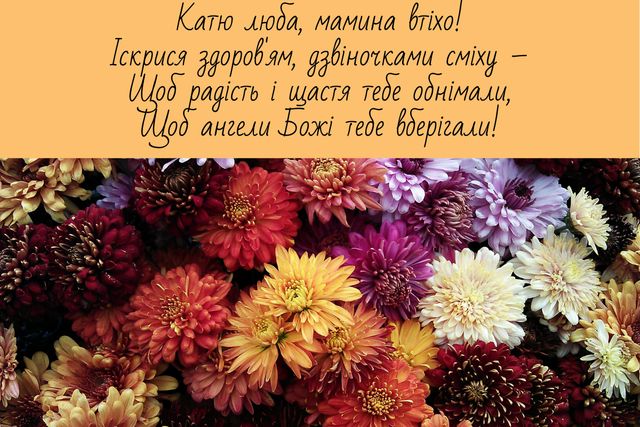 Вітаю з Днем святої Катерини. Щиро бажаю добра і світу, чуйності серця і величі душі, благих намірів у житті та значних досягнень у будь-якій справі, щирої радості та світлої надії, міцної віри та безмежного щастя.